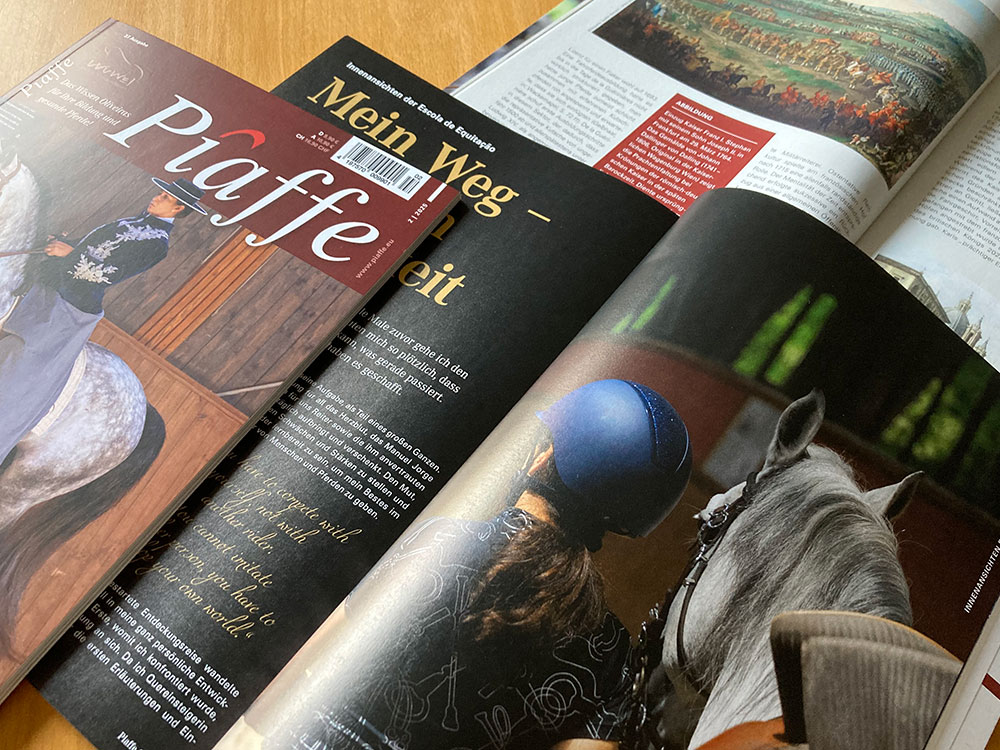 Belegexemplare zu erhalten ist immer eine große Freude! Insbesondere beim Layout des Magazins Piaffe, wenn nach einigen Monaten Arbeit, nach der Entwicklung vom Rohling zum Layout, nach Bildauswahl, Abstimmung, Änderungen und dem Lektorat endlich das Ergebnis auf dem Tisch liegt!